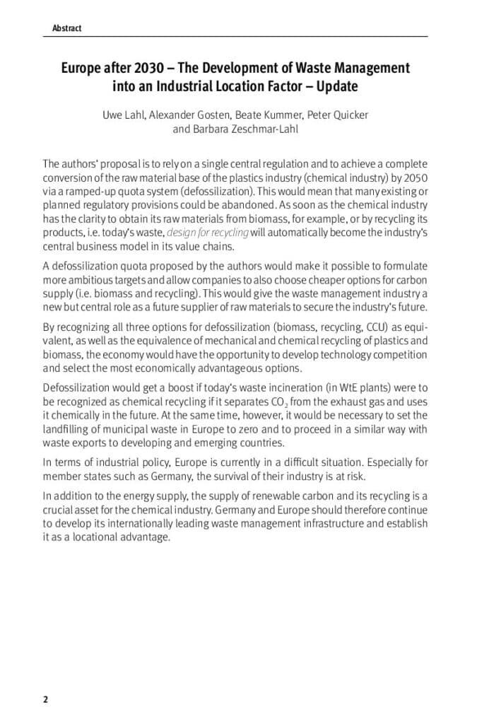 Europa nach 2030 – Die Entwicklung der Abfallwirtschaft zum industriellen Standortfaktor – ein Update